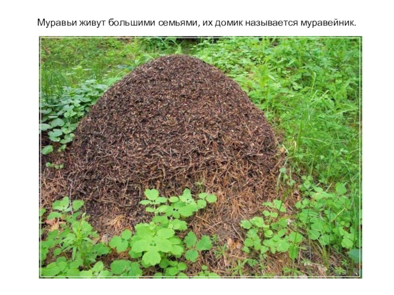Слайд 10Муравьи живут большими семьями, их домик называется муравейник.