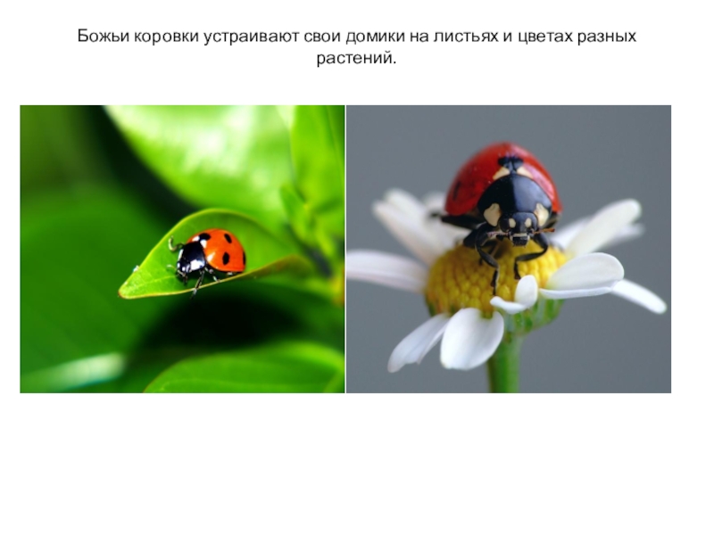 Слайд 4Божьи коровки устраивают свои домики на листьях и цветах разных растений.