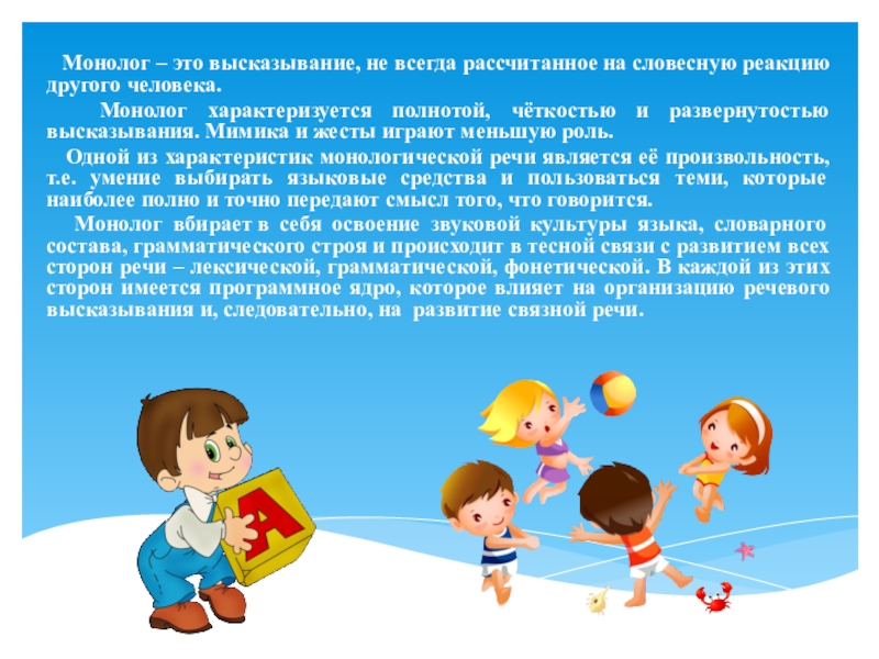 Монолог вбирает в себя освоение звуковой культуры языка, словарного состава, грамматического строя и происходит в тесной связи с развитием всех сторон речи – лексической, грамматической, фонетической. В каждой из этих сторон имеется программное ядро, которое влияет на организацию речевого высказывания и, следовательно, на развитие связной речи.