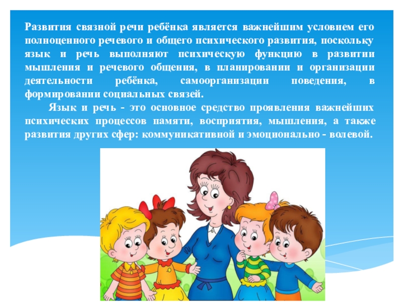 общего психического развития, поскольку язык и речь выполняют психическую функцию в развитии мышления и речевого общения, в планировании и организации деятельности ребёнка, самоорганизации поведения, в формировании социальных связей.