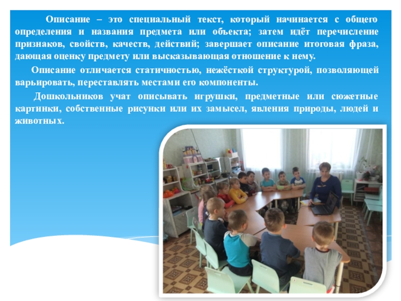 Дошкольников учат описывать игрушки, предметные или сюжетные картинки, собственные рисунки или их замысел, явления природы, людей и животных.