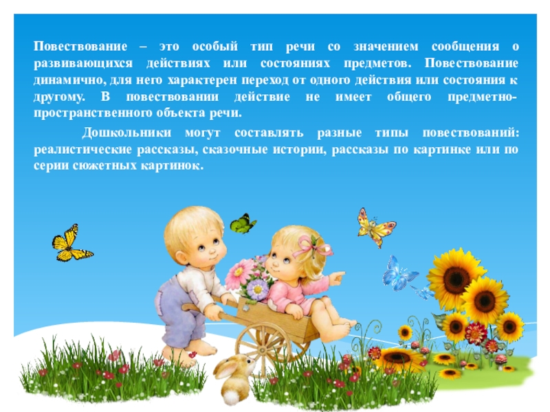 Дошкольники могут составлять разные типы повествований: реалистические рассказы, сказочные истории, рассказы по картинке или по серии сюжетных картинок.