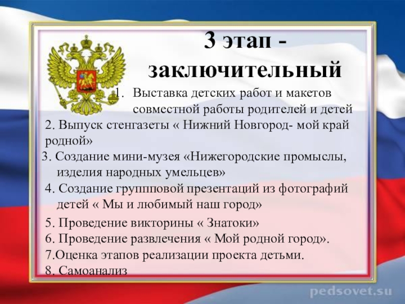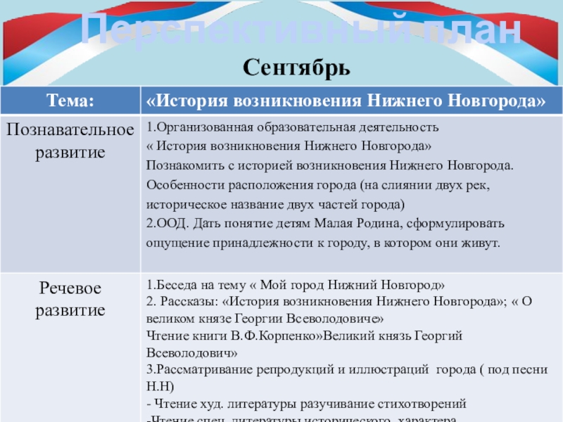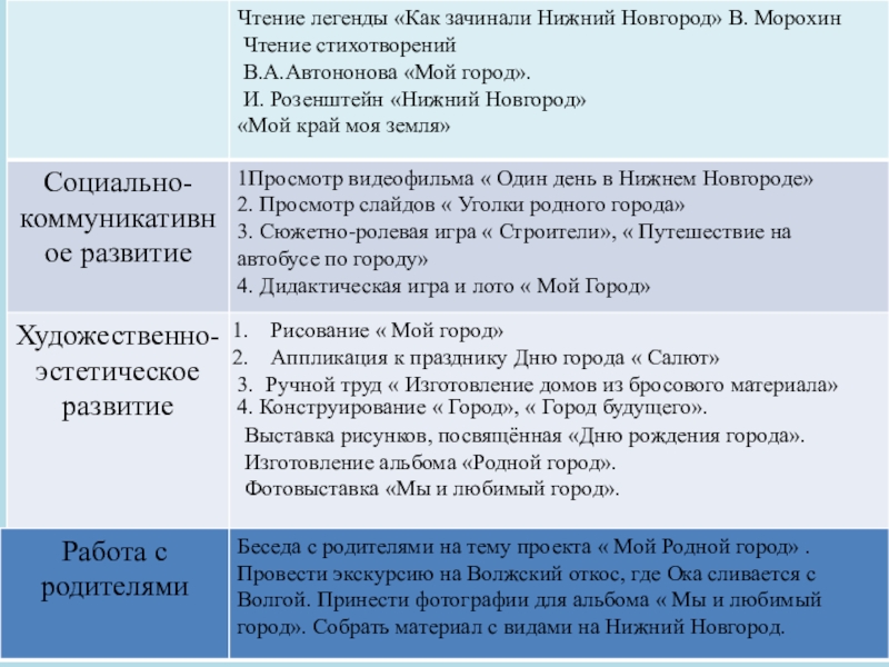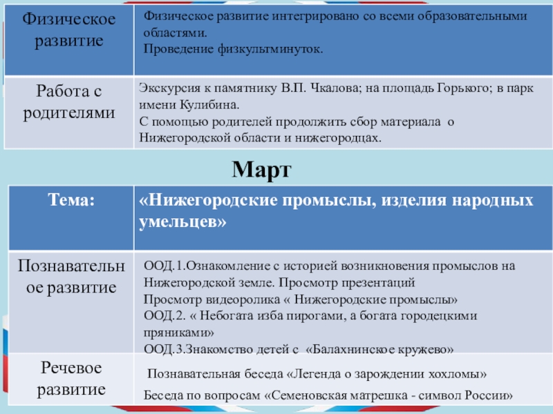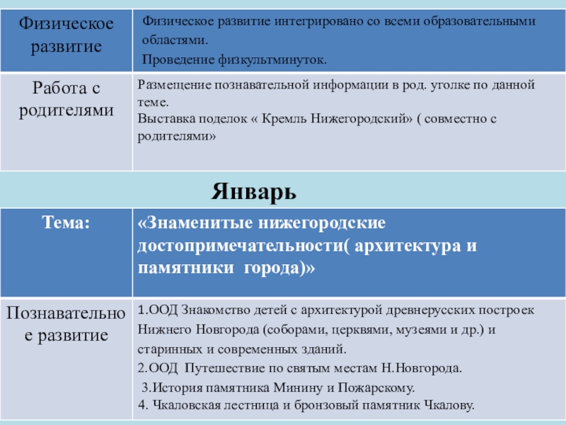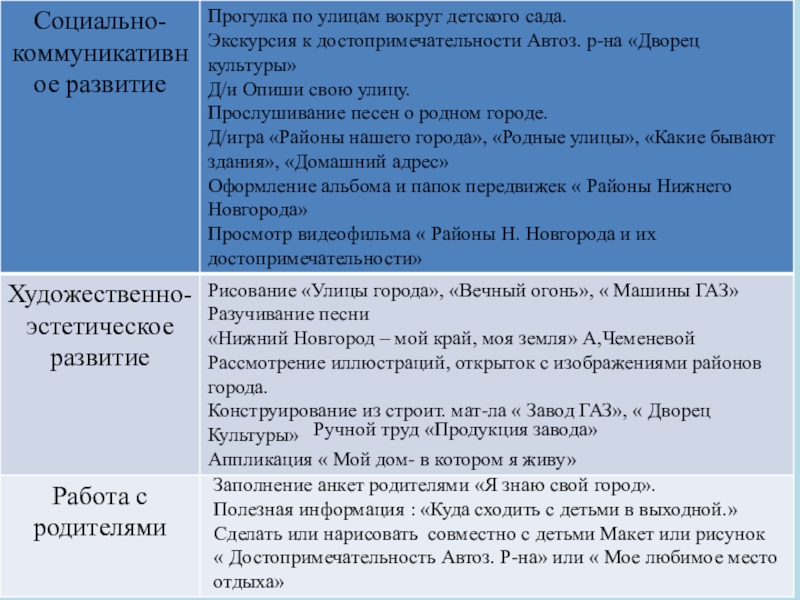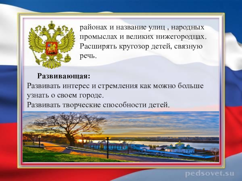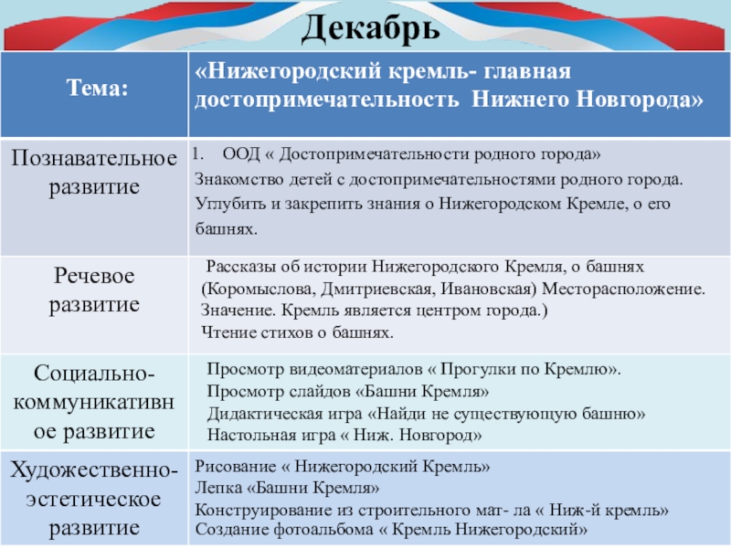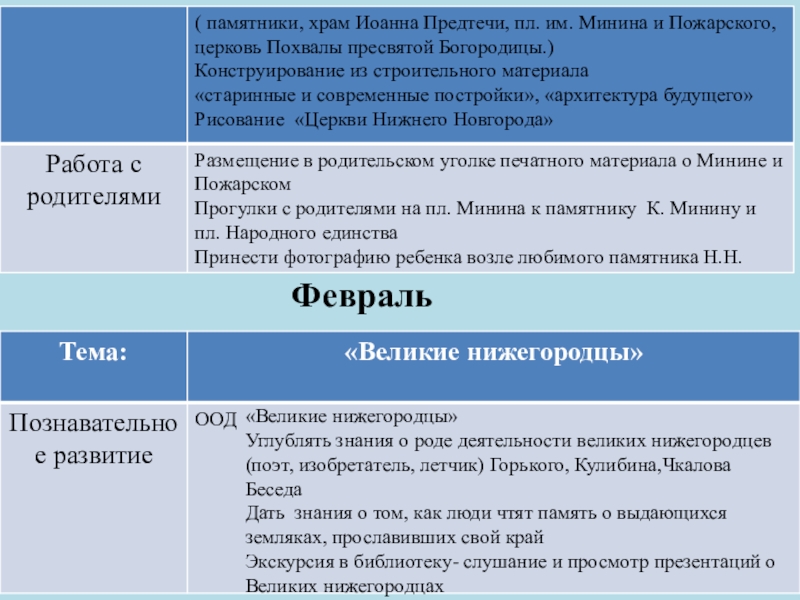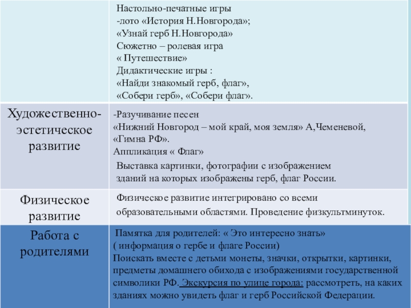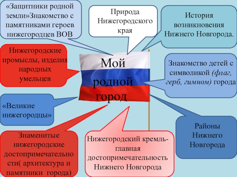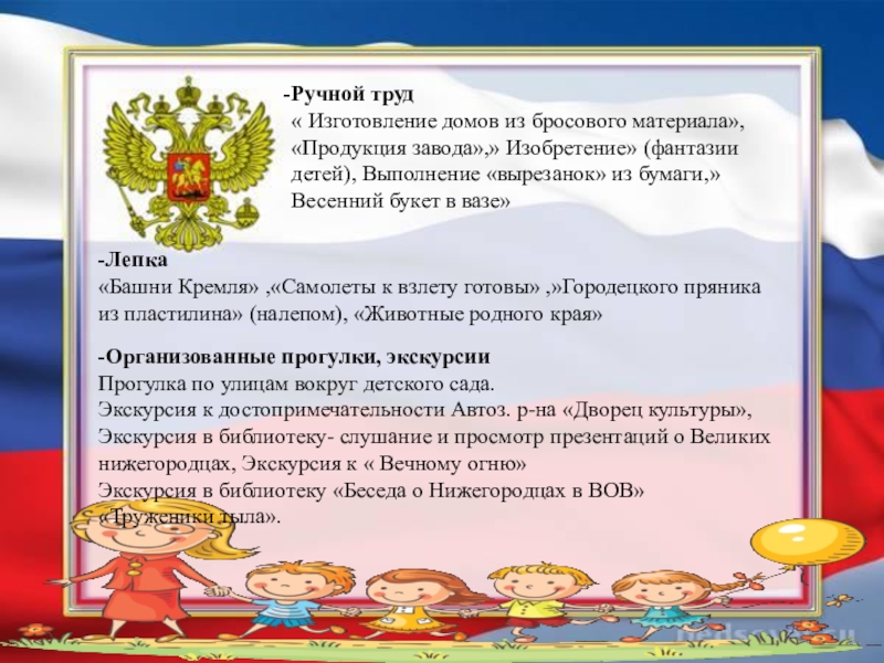 рассмотреть, на каких зданиях можно увидеть флаг и герб РФ, прогулки с родителями на пл. Минина к памятнику К. Минину и пл. Народного единства, сходить с детьми на экскурсию в музей нижегородских промыслов , к памятнику В.П. Чкалова; на площадь Горького; в парк имени Кулибина; к памятнику В.П. Чкалова; на площадь Горького; в парк имени Кулибина. Экскурсия к памятнику погибшим в годы ВОВ (в разных районах );экскурсия в кремль на выставку боевой техники