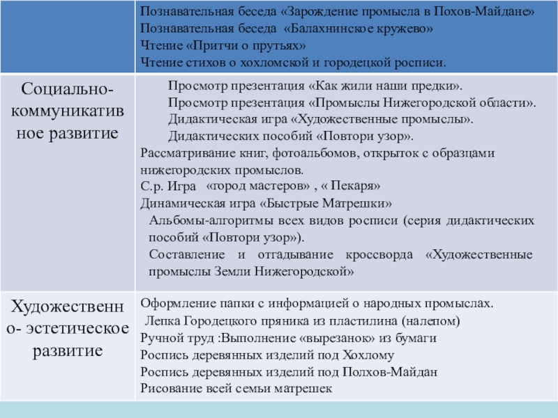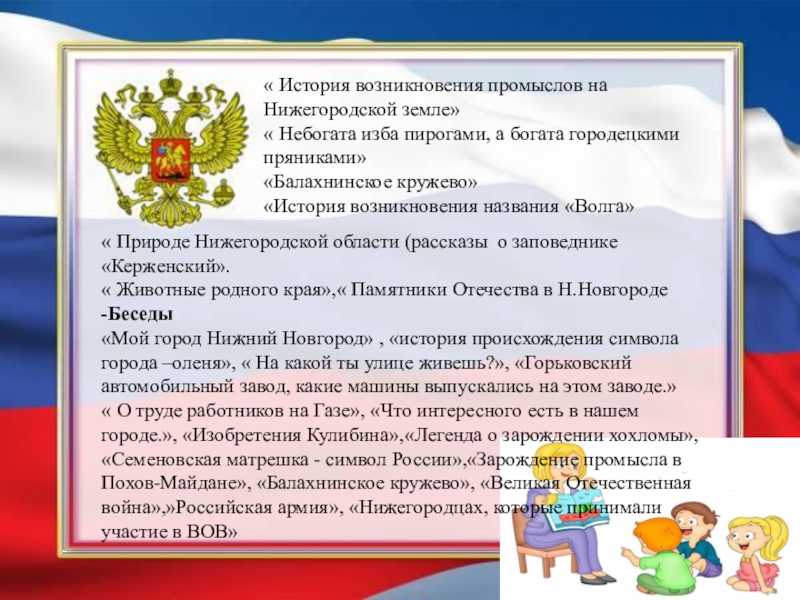 « О труде работников на Газе», «Что интересного есть в нашем городе.», «Изобретения Кулибина»,«Легенда о зарождении хохломы», «Семеновская матрешка - символ России»,«Зарождение промысла в Похов-Майдане», «Балахнинское кружево», «Великая Отечественная война»,»Российская армия», «Нижегородцах, которые принимали участие в ВОВ»