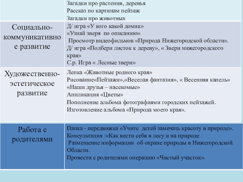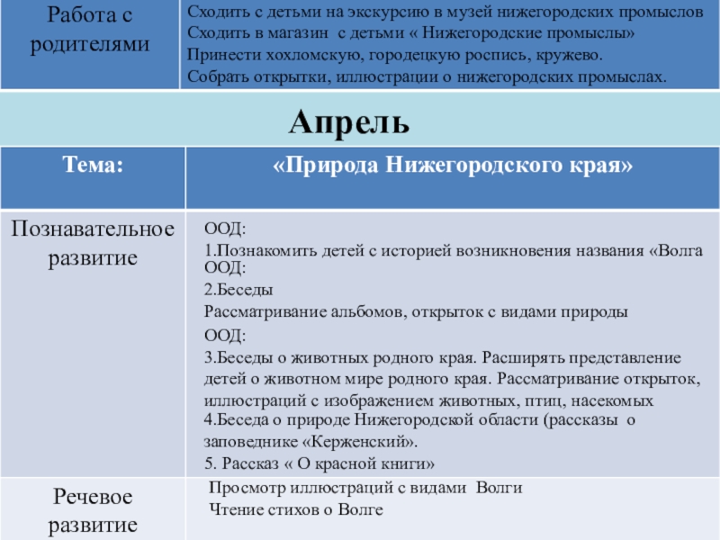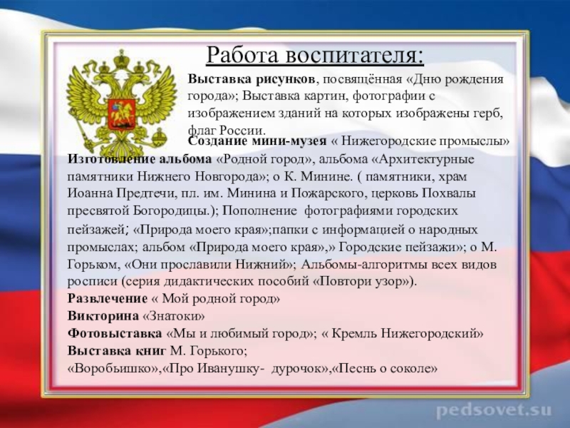 ( информация о гербе и флаге России); «Куда сходить с детьми в выходной.» ; материал о Минине и Пожарском; папка - передвижка «Учите детей замечать красоту в природе»; информации об охране природы в Нижегородской Области.