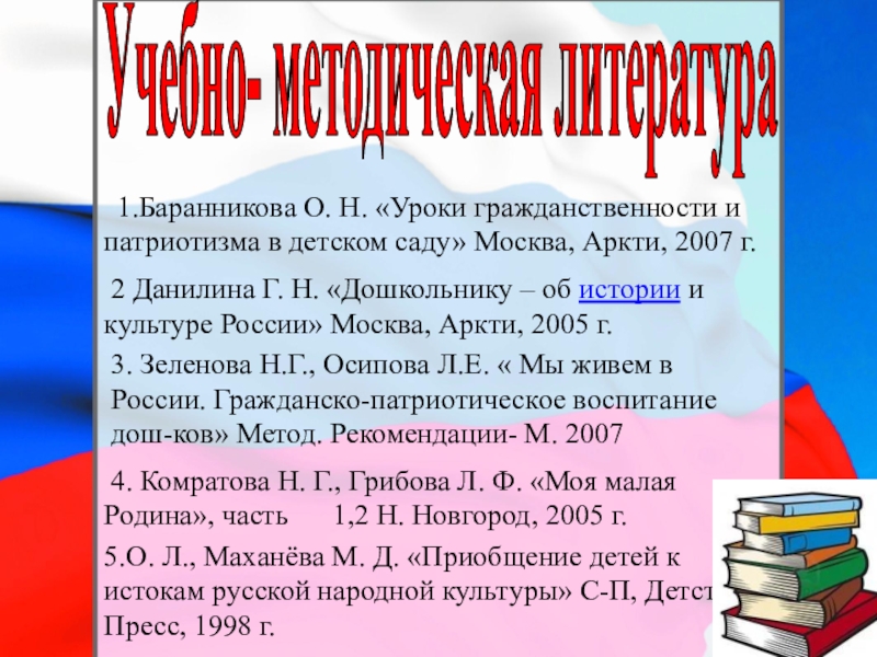 3. Зеленова Н.Г., Осипова Л.Е. « Мы живем в России. Гражданско-патриотическое воспитание дош-ков» Метод. Рекомендации- М. 2007