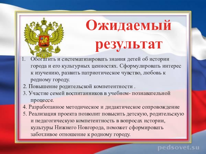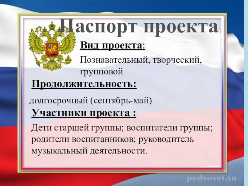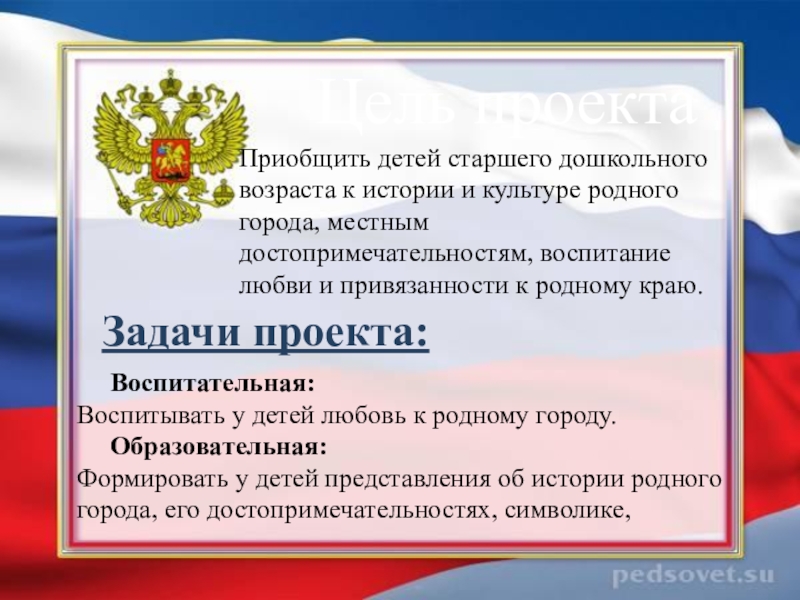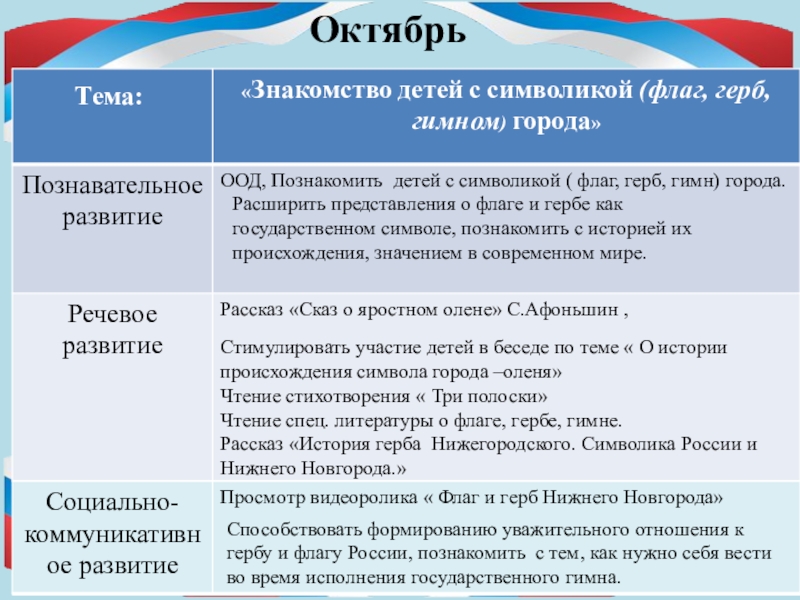 Способствовать формированию уважительного отношения к гербу и флагу России, познакомить с тем, как нужно себя вести во время исполнения государственного гимна.