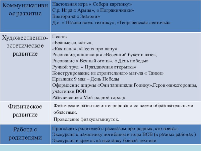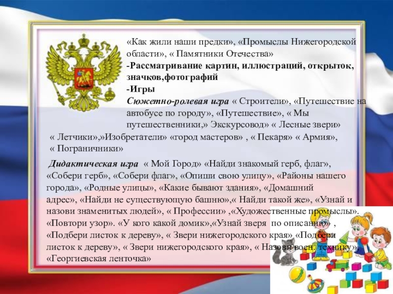 «Собери герб», «Собери флаг», «Опиши свою улицу», «Районы нашего города», «Родные улицы», «Какие бывают здания», «Домашний адрес», «Найди не существующую башню»,« Найди такой же», «Узнай и назови знаменитых людей», « Профессии» ,«Художественные промыслы».«Повтори узор». «У кого какой домик»,«Узнай зверя по описанию» ,«Подбери листок к дереву», « Звери нижегородского края» «Подбери листок к дереву», « Звери нижегородского края», « Назови воен. технику», «Георгиевская ленточка»