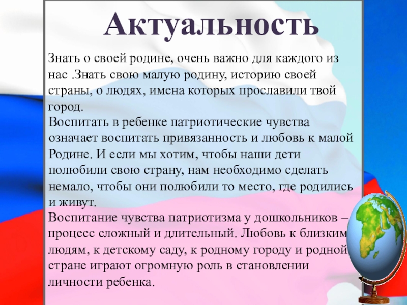 Воспитание чувства патриотизма у дошкольников – процесс сложный и длительный. Любовь к близким людям, к детскому саду, к родному городу и родной стране играют огромную роль в становлении личности ребенка.
