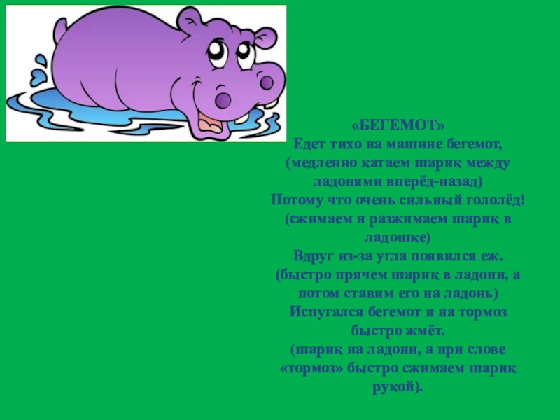 (шарик на ладони, а при слове «тормоз» быстро сжимаем шарик рукой).
