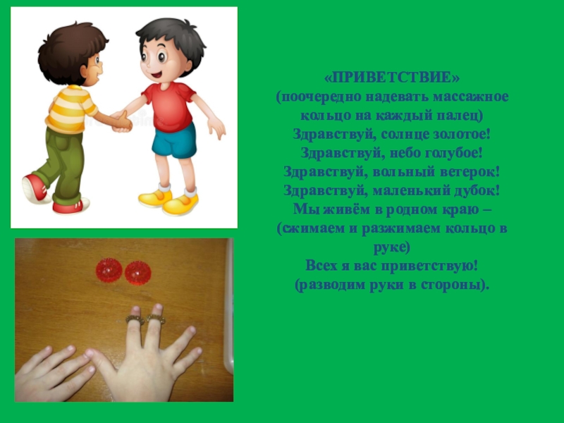(поочередно надевать массажное кольцо на каждый палец)