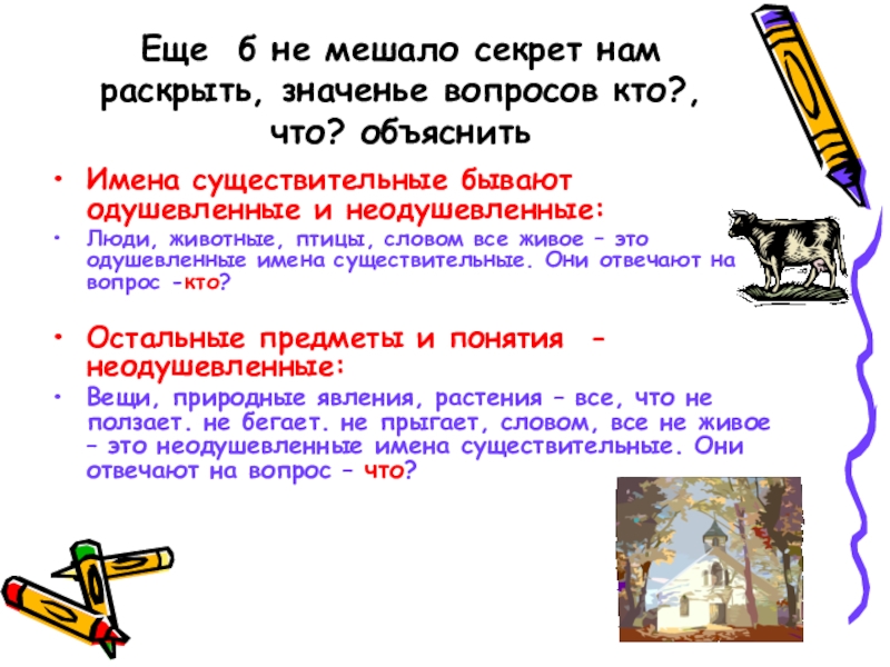 Имена существительные бывают одушевленные и неодушевленные: