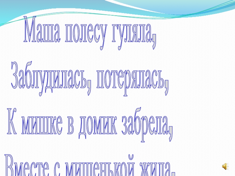 Маша полесу гуляла,Заблудилась, потерялась,К мишке в домик забрела,Вместе с мишенькой жила.