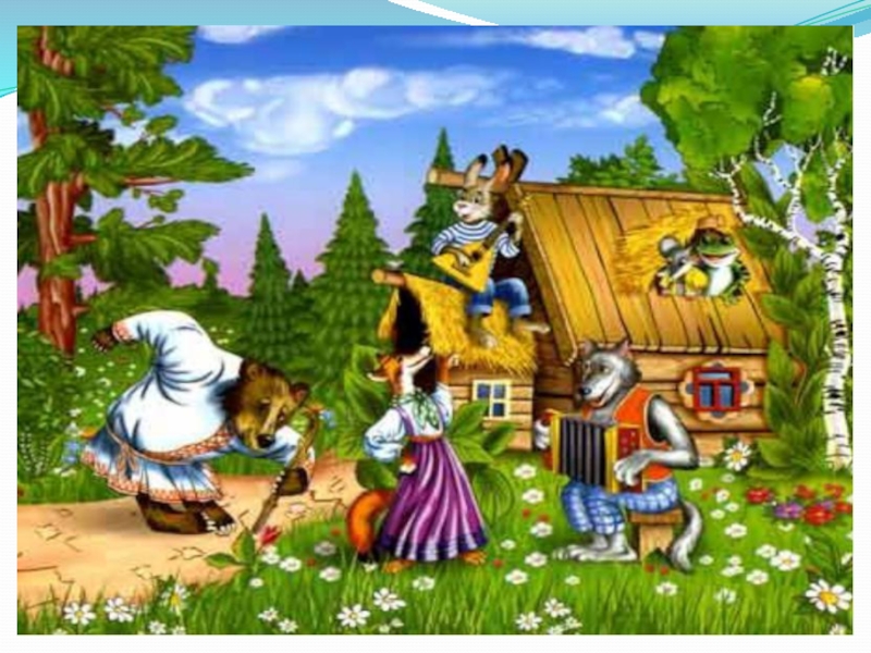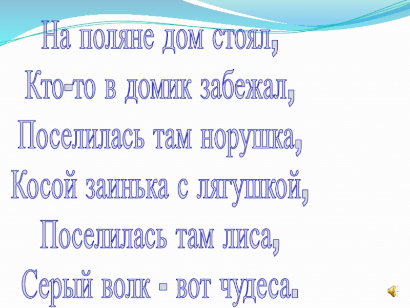 На поляне дом стоял,Кто-то в домик забежал,Поселилась там норушка,Косой заинька с лягушкой,Поселилась там лиса,Серый волк - вот