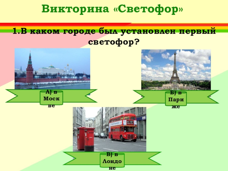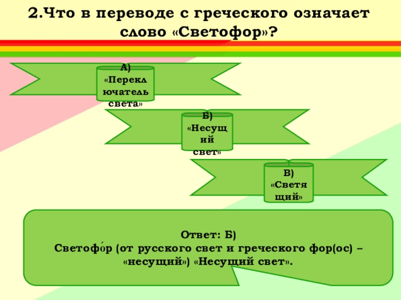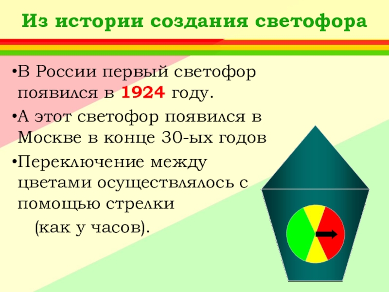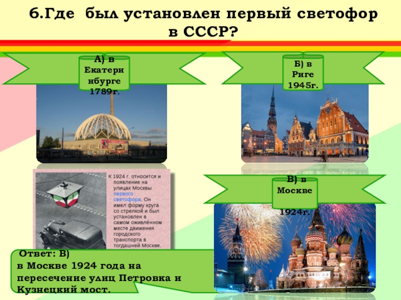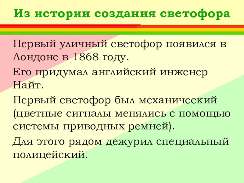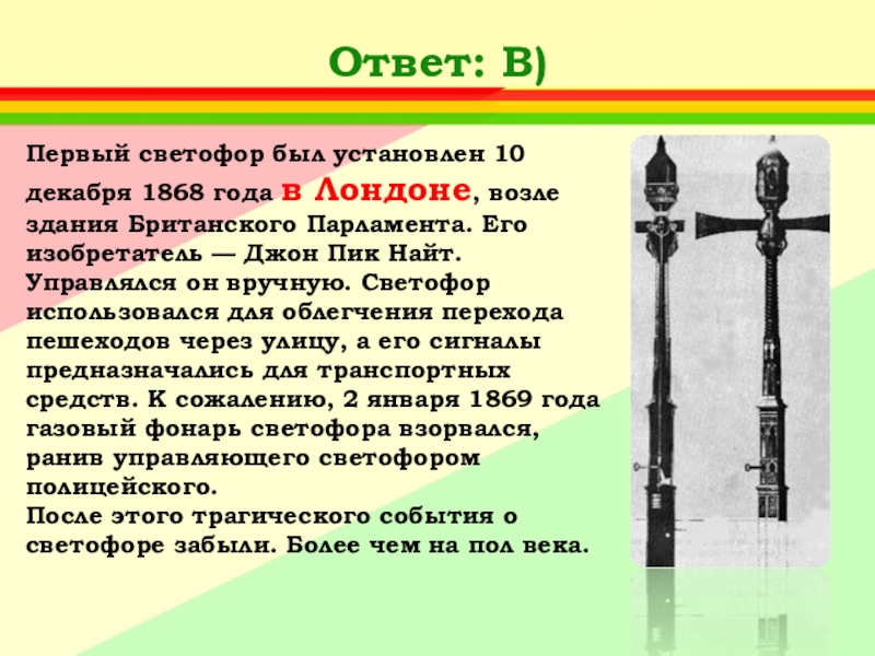 Ответ: А) Придумал его английский инженер Найт.Первый светофор был механическим: цветные сигналы менялись в нем с помощью системы приводных ремней.
