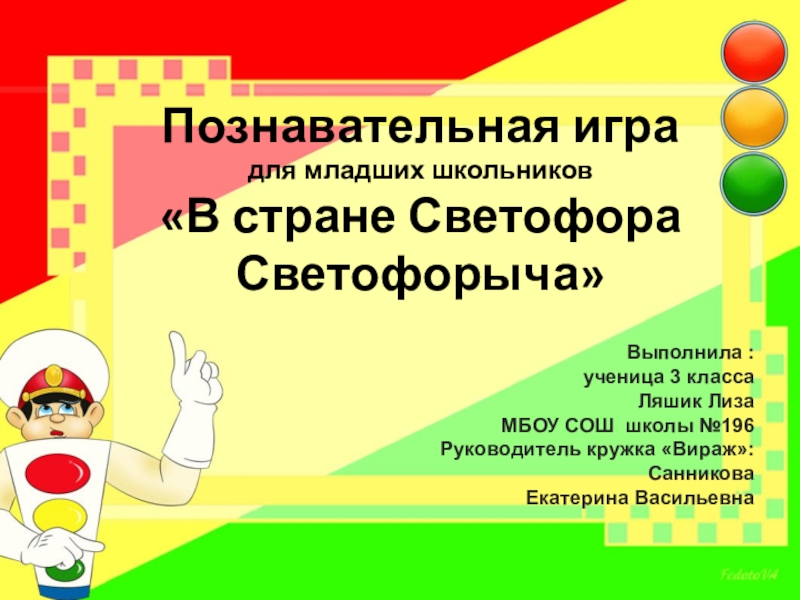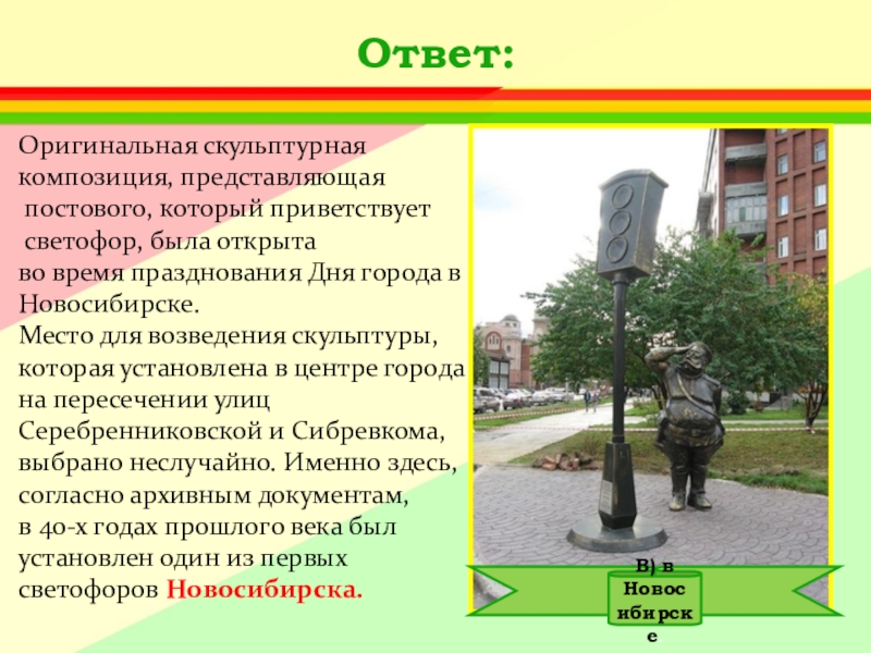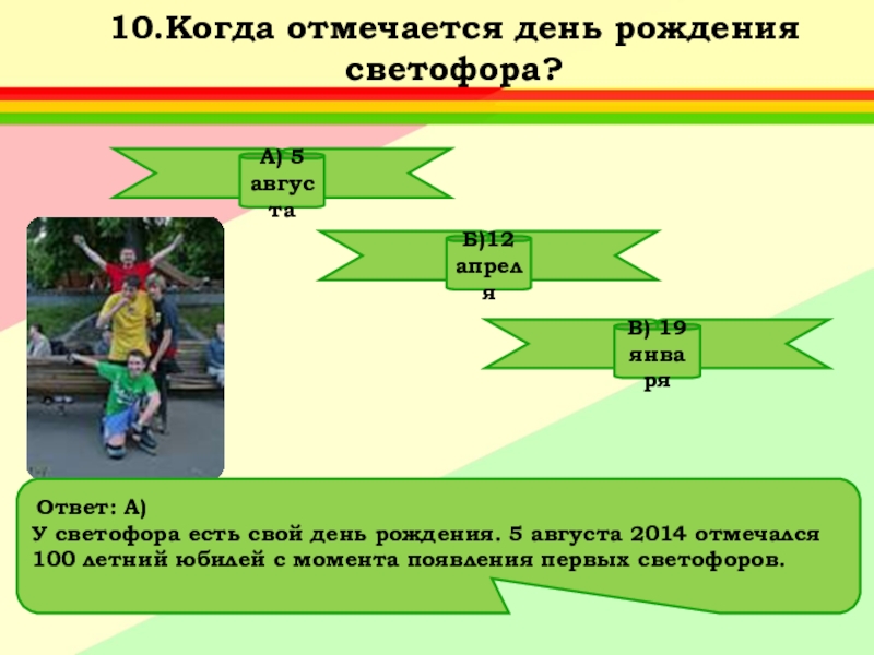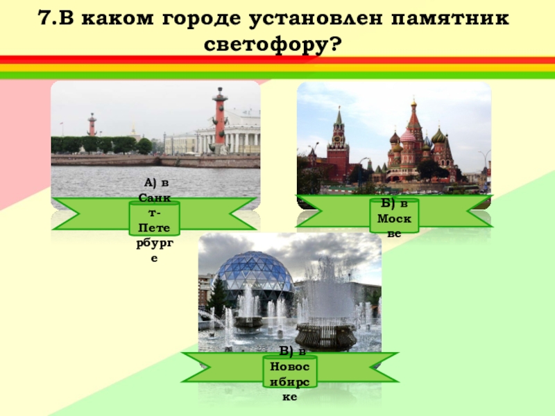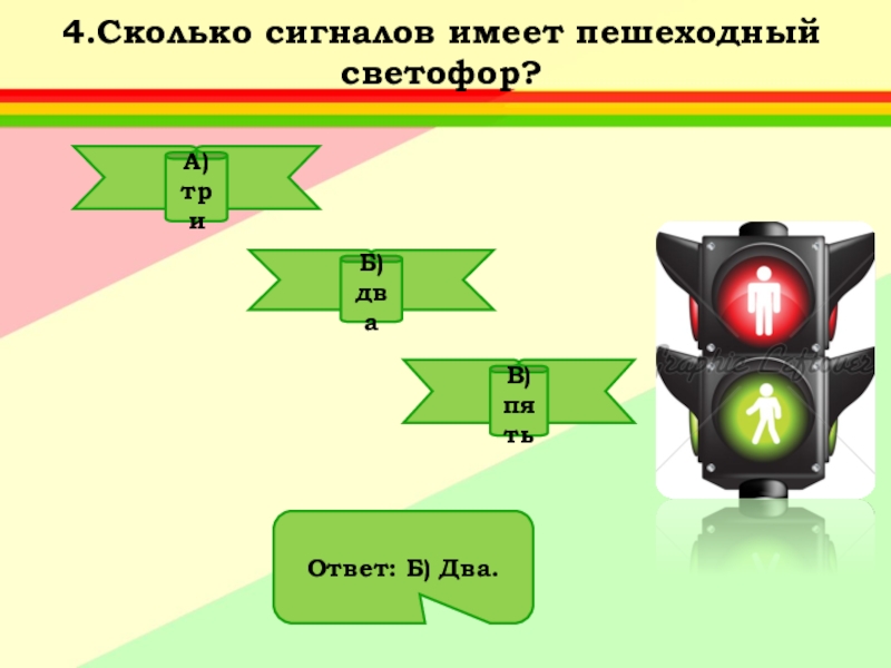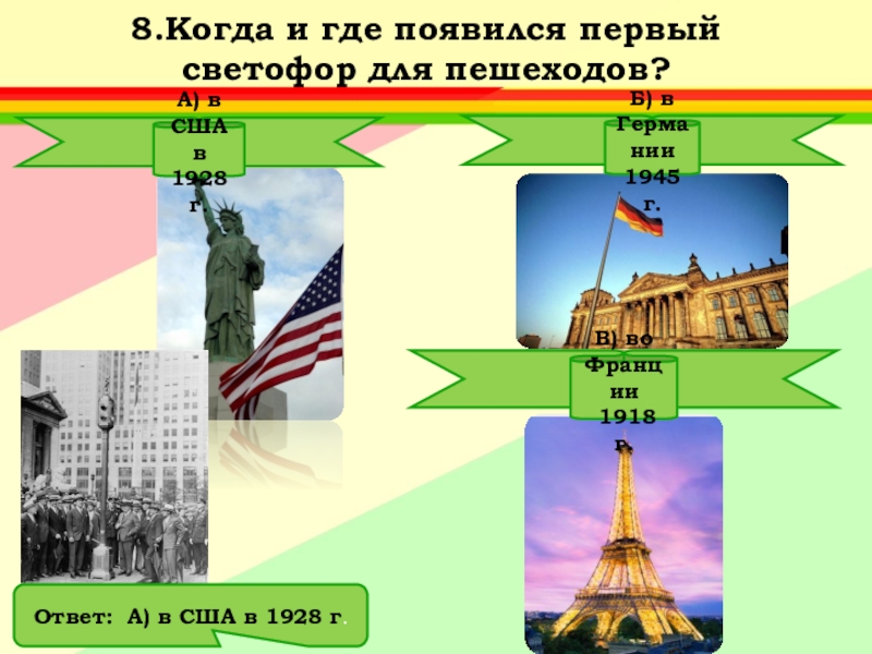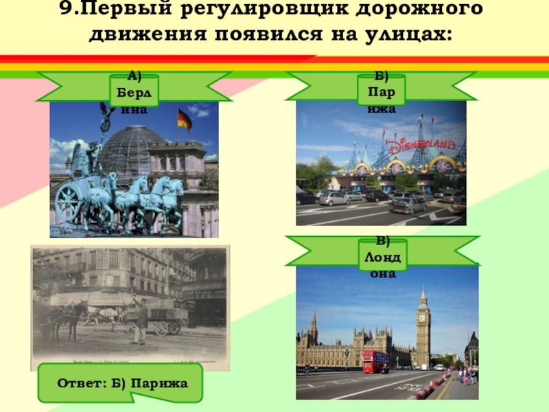 Ответ: А) Придумал его английский инженер Найт.Первый светофор был механическим: цветные сигналы менялись в нем с помощью системы приводных ремней.