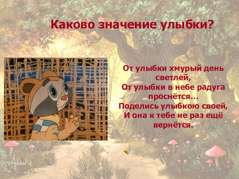 Каково значение улыбки?От улыбки хмурый день светлей,От улыбки в небе радуга проснётся…Поделись улыбкою своей, И она к
