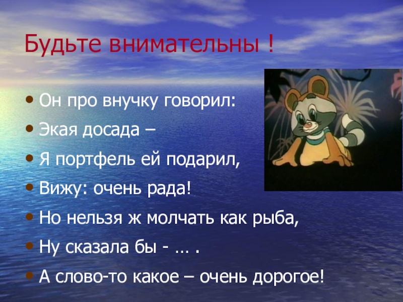 Будьте внимательны !Он про внучку говорил:Экая досада – Я портфель ей подарил,Вижу: очень рада!Но нельзя ж молчать