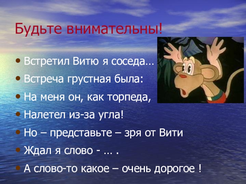 Будьте внимательны!Встретил Витю я соседа…Встреча грустная была:На меня он, как торпеда,Налетел из-за угла!Но – представьте – зря