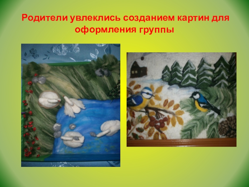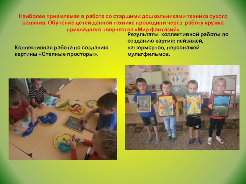 Результаты коллективной работы по созданию картин: пейзажей, натюрмортов, персонажей мультфильмов.