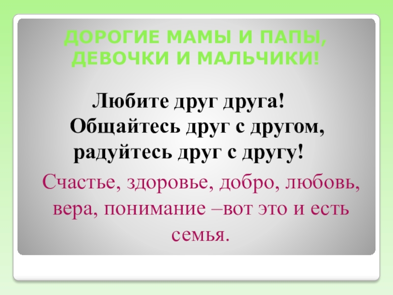 Счастье, здоровье, добро, любовь, вера, понимание –вот это и есть семья.