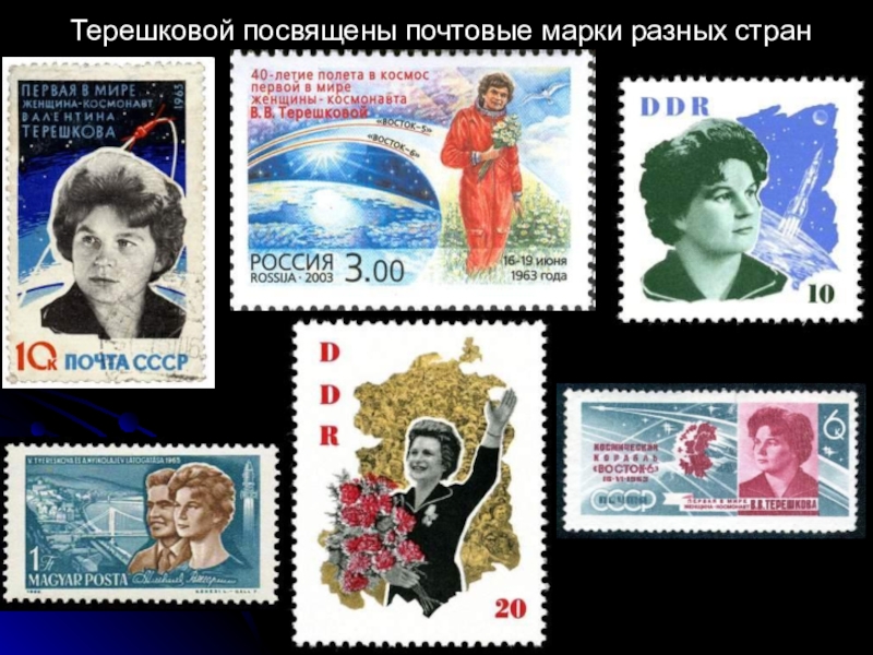 Слайд 14Терешковой посвящены почтовые марки разных стран