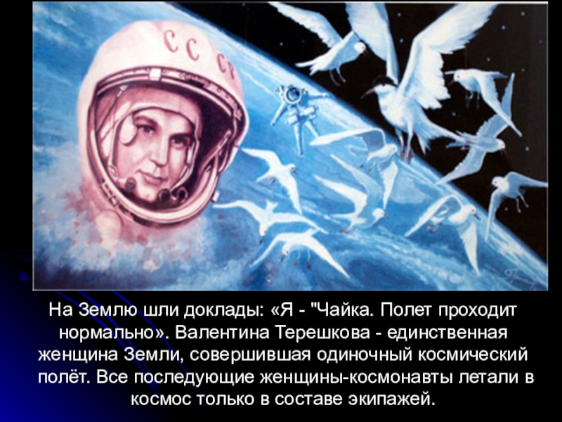 Слайд 9На Землю шли доклады: «Я - "Чайка. Полет проходит нормально». Валентина