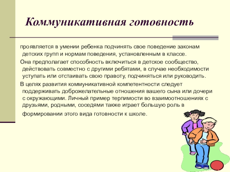 Она предполагает способность включиться в детское сообщество, действовать совместно с другими ребятами, в случае необходимости уступать или отстаивать свою правоту, подчиняться или руководить.