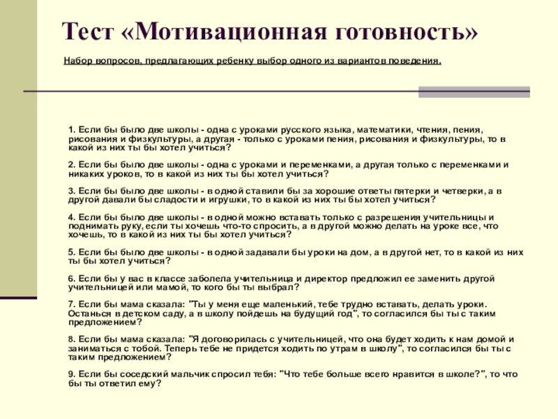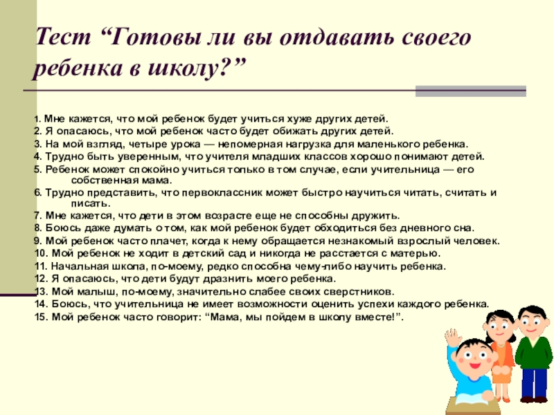 Слайд 2Тест “Готовы ли вы отдавать своего ребенка в школу?”