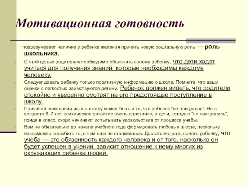 Причиной нежелания идти в школу может быть и то, что ребенок “не наигрался”. Но в возрасте 6–7 лет психическое развитие очень пластично, и дети, которые “не наигрались”, придя в класс, скоро начинают испытывать удовольствие от процесса учебы.