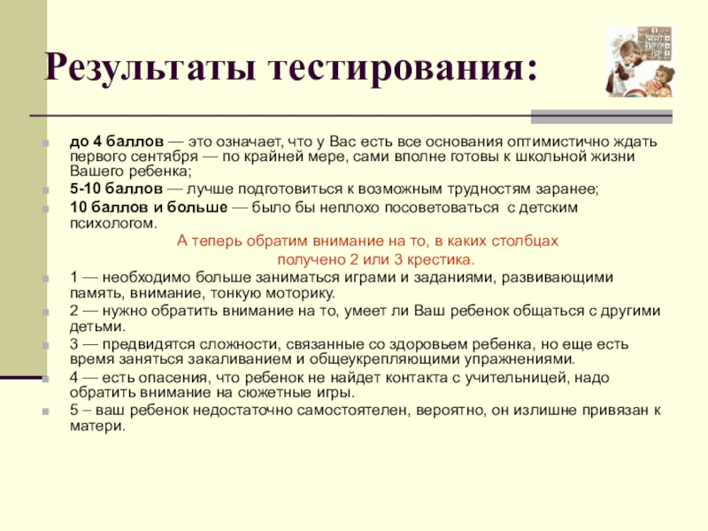 4 — есть опасения, что ребенок не найдет контакта с учительницей, надо обратить внимание на сюжетные игры.