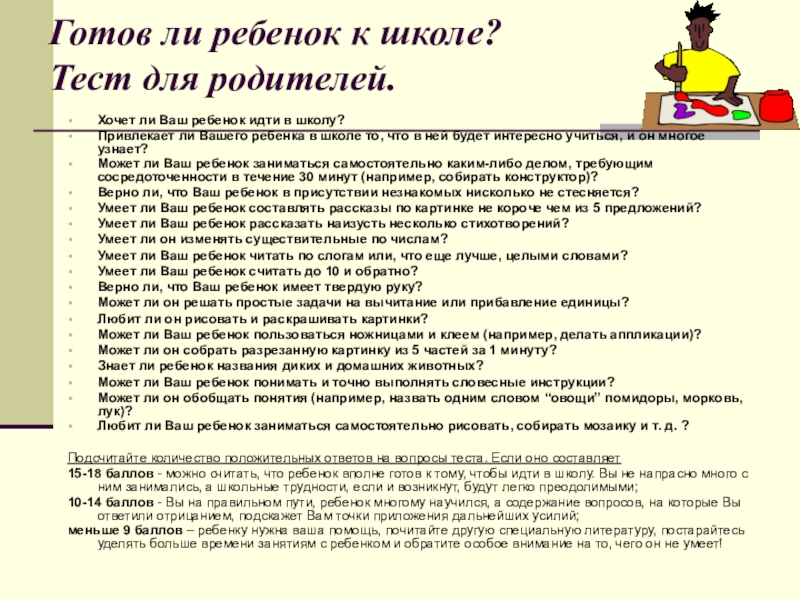 15-18 баллов - можно считать, что ребенок вполне готов к тому, чтобы идти в школу. Вы не напрасно много с ним занимались, а школьные трудности, если и возникнут, будут легко преодолимыми;