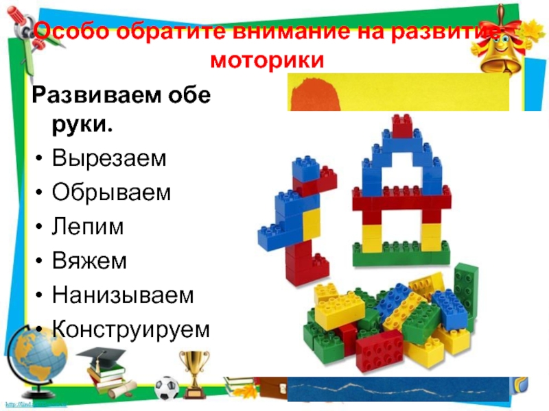Слайд 15Особо обратите внимание на развитие моторики