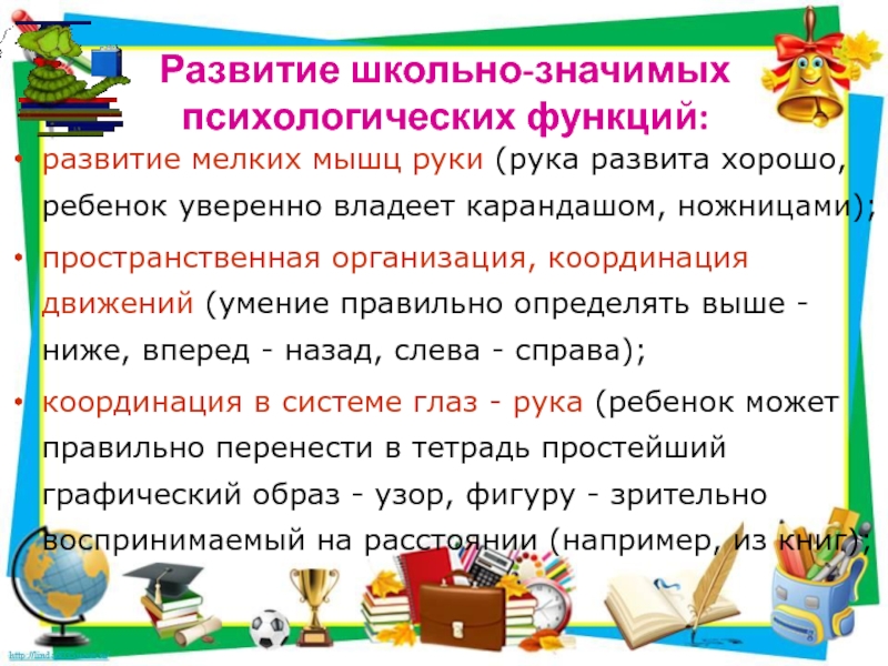 Слайд 8Развитие школьно-значимых психологических функций:
