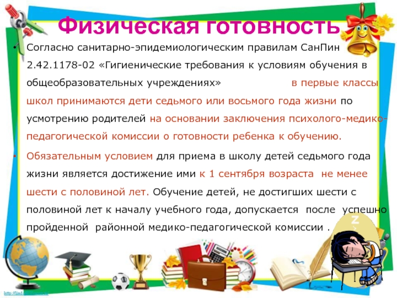 в общеобразовательных учреждениях» в первые классы школ принимаются дети седьмого или восьмого года жизни по усмотрению родителей на основании заключения психолого-медико-педагогической комиссии о готовности ребенка к обучению.