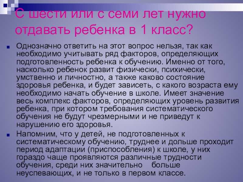 Однозначно ответить на этот вопрос нельзя, так как необходимо учитывать ряд факторов, определяющих подготовленность ребенка к обучению. Именно от того, насколько ребенок развит физически, психически, умственно и личностно, а также каково состояние здоровья ребенка, и будет зависеть, с какого возраста ему необходимо начать обучение в школе. Имеет значение весь комплекс факторов, определяющих уровень развития ребенка, при котором требования систематического обучения не будут чрезмерными и не приведут к нарушению его здоровья.