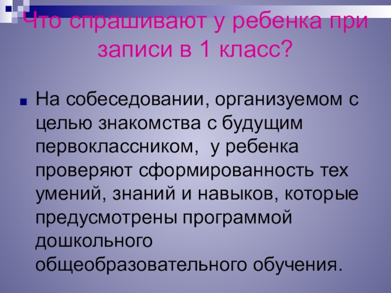 Слайд 17Что спрашивают у ребенка при записи в 1 класс?