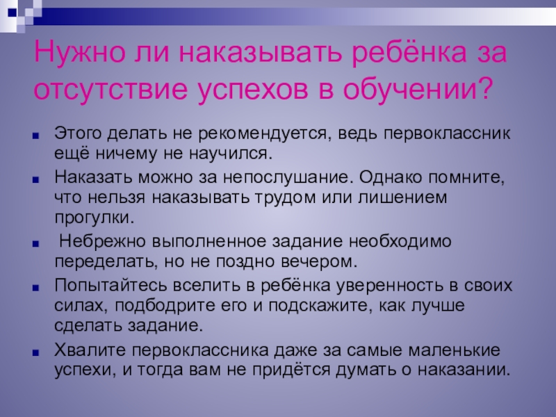 Слайд 38Нужно ли наказывать ребёнка за отсутствие успехов в обучении?