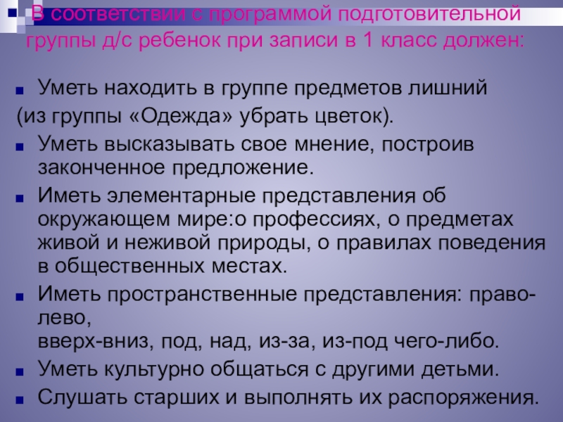 Слайд 18В соответствии с программой подготовительной группы д/с ребенок при записи в