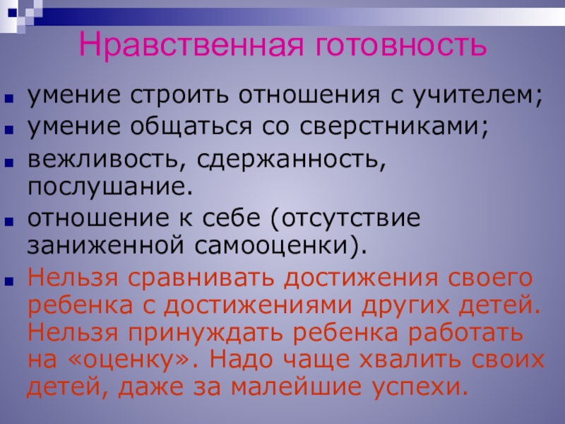 Нельзя сравнивать достижения своего ребенка с достижениями других детей. Нельзя принуждать ребенка работать на «оценку». Надо чаще хвалить своих детей, даже за малейшие успехи.