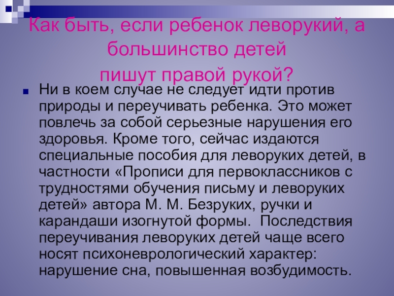 Ни в коем случае не следует идти против природы и переучивать ребенка. Это может повлечь за собой серьезные нарушения его здоровья. Кроме того, сейчас издаются специальные пособия для леворуких детей, в частности «Прописи для первоклассников с трудностями обучения письму и леворуких детей» автора М. М. Безруких, ручки и карандаши изогнутой формы. Последствия переучивания леворуких детей чаще всего носят психоневрологический характер: нарушение сна, повышенная возбудимость.