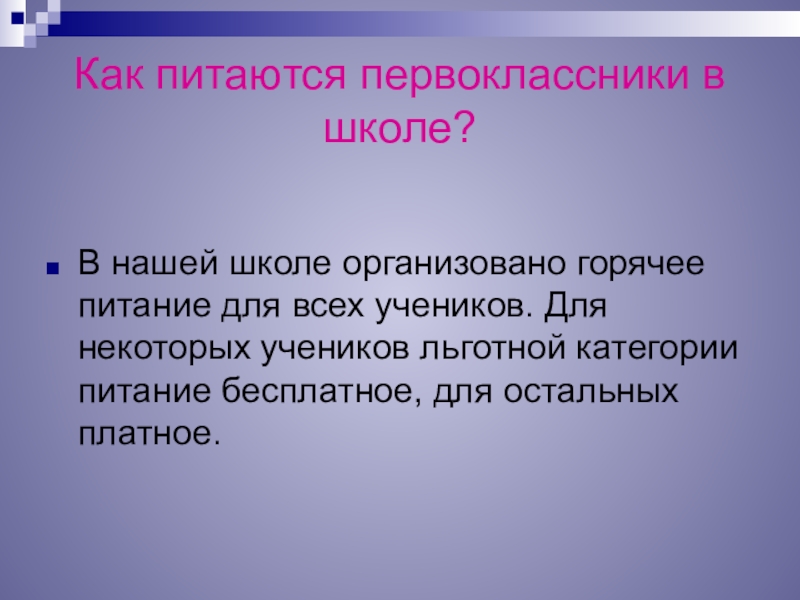 особый режим дня. Уроки длятся 35 минут, в середине каждого урока проводятся 1-2 физкультурные минутки. Первое время в расписании первоклассников всего 3 урока, чтобы им легче было привыкать к новому виду деятельности - учебной.