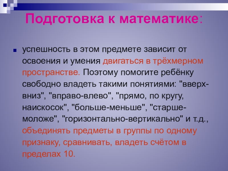 двигаться в трёхмерном пространстве. Поэтому помогите ребёнку свободно владеть такими понятиями: "вверх-вниз", "вправо-влево", "прямо, по кругу, наискосок", "больше-меньше", "старше-моложе", "горизонтально-вертикально" и т.д., объединять предметы в группы по одному признаку, сравнивать, владеть счётом в пределах 10.