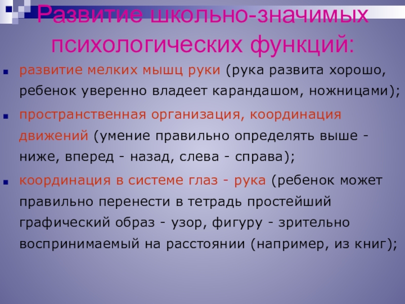 Слайд 7Развитие школьно-значимых психологических функций (продолжение):