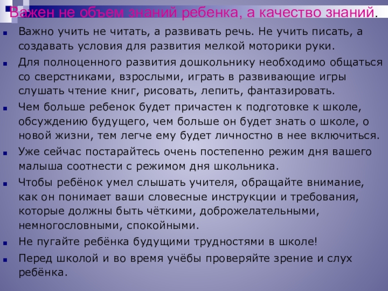 Слайд 9Важен не объем знаний ребенка, а качество знаний.
