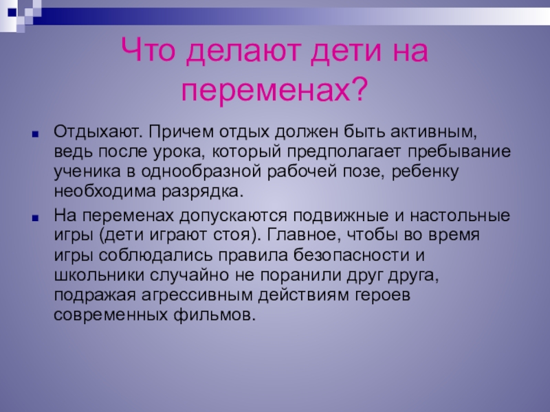 На переменах допускаются подвижные и настольные игры (дети играют стоя). Главное, чтобы во время игры соблюдались правила безопасности и школьники случайно не поранили друг друга, подражая агрессивным действиям героев современных фильмов.