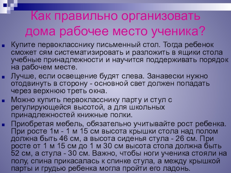 Приобретая мебель, обязательно учитывайте рост ребенка. При росте 1м - 1 м 15 см высота крышки стола над полом должна быть 46 см, а высота сиденья стула - 26 см. При росте от 1 м 15 см до 1 м 30 см высота стола должна быть 52 см, а стула - 30 см. Важно, чтобы ноги ученика стояли на полу, спина прикасалась к спинке стула, а между крышкой парты и грудью ребенка могла пройти его ладонь.