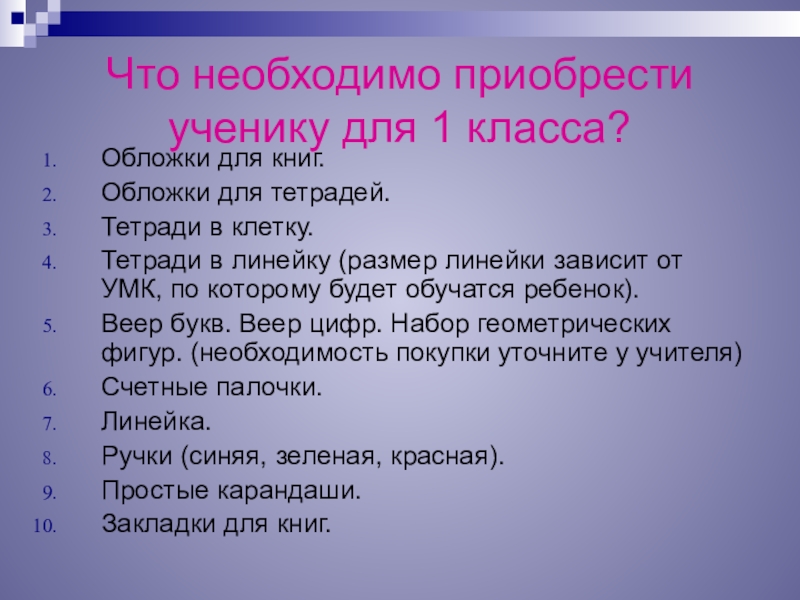 Слайд 25Что необходимо приобрести ученику для 1 класса?
