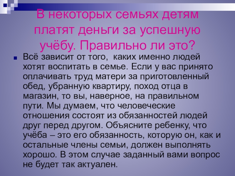 Слайд 31В некоторых семьях детям платят деньги за успешную учёбу. Правильно ли