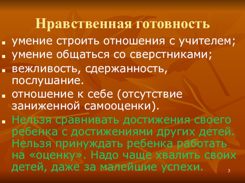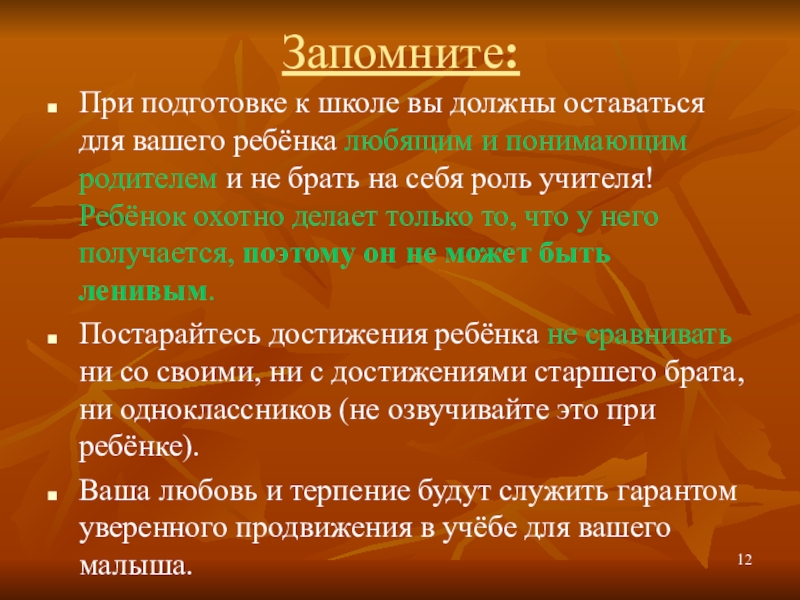 Нельзя сравнивать достижения своего ребенка с достижениями других детей. Нельзя принуждать ребенка работать на «оценку». Надо чаще хвалить своих детей, даже за малейшие успехи.